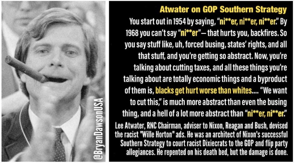The 2004 GOP that swiftboated John Kerry has Atwater to thank. The increasingly-hostile “White men built this country” rhetoric stems from the efforts of men like him. When Steve Bannon states “This is not about persuasion. This is about disorientation.” he is channeling Atwater and his white hood and sheet. Project 2025 had to start somewhere. And the brand of micro-aggressive manhood displayed by JD Vance, Tucker Carlson, Jesse Watters, and crypto-bros is a brand that Lee Atwater played a part in building.