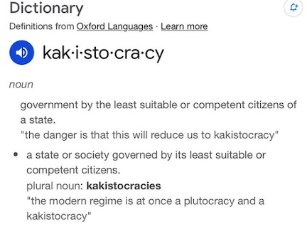 Kakistocracy is government by the worst, most incompetent persons. Besides my link about our new form of government, you can read more here. If we don’t do something soon—and non-wealthy Trump voters, you can help—kaskistocracy will replace democracy.