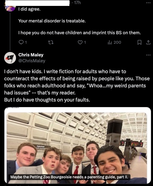 A recent Twitter conversation, copied below, inspired this blog post. Re-reading my response to bro-patriarch prompted me to think,“Whoa…there it is: Chris Maley’s audience, also why he writes for them, succinctly stated.”