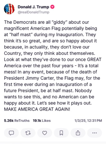 On January 20th, 2025: flags will fly at half-staff honoring the 39th President of the United States.